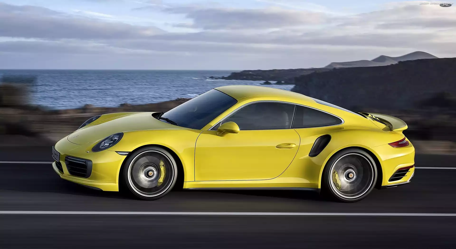Samochód: Jezioro, Droga, Porsche, Żółte, 911 Turbo